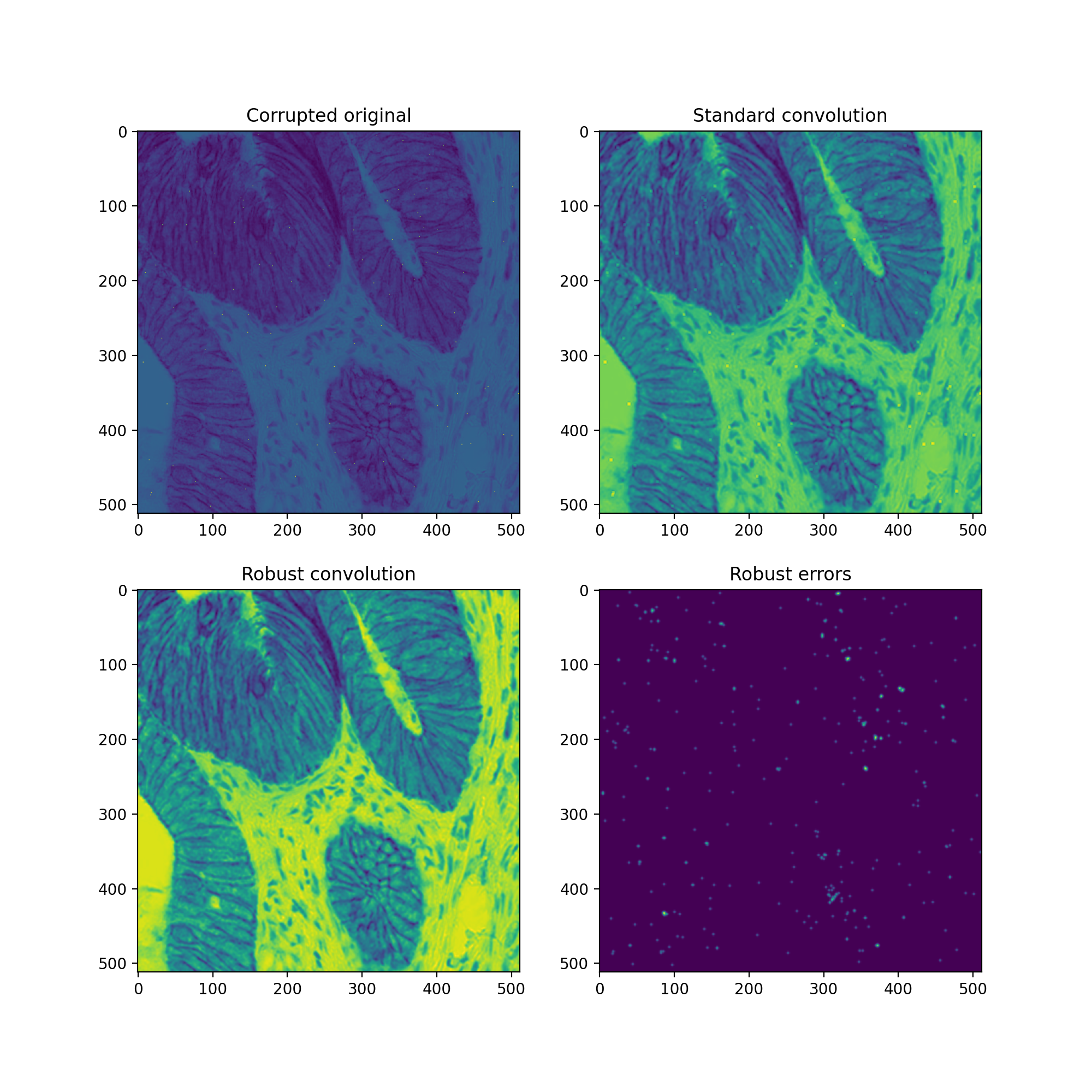 The above example shows an artificially corrupted image, the effects of convolution without removing outliers, a convolution with outliers removed, and the resulting errors from the robust convolution algorithm. Visually, all outliers have been removed.