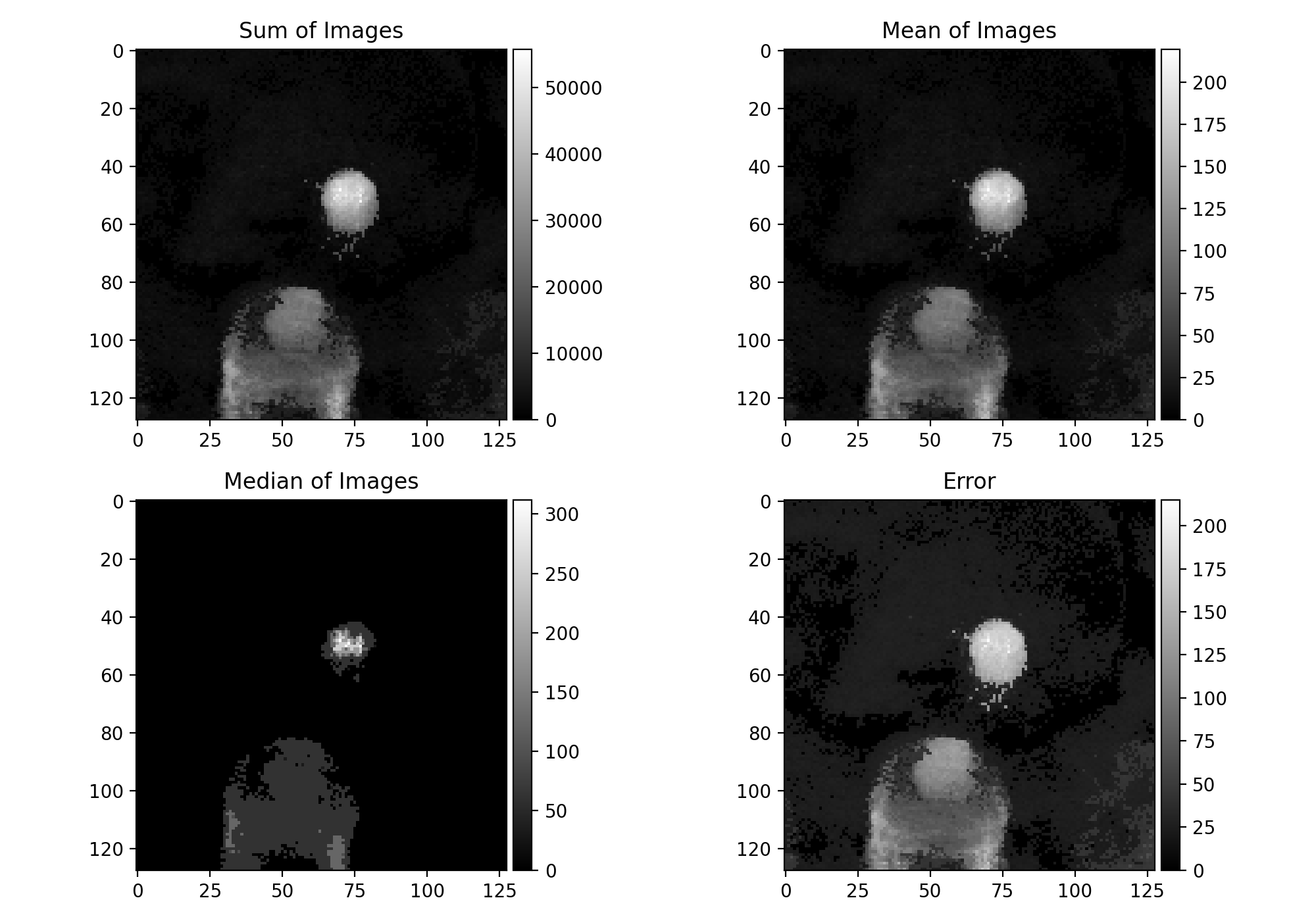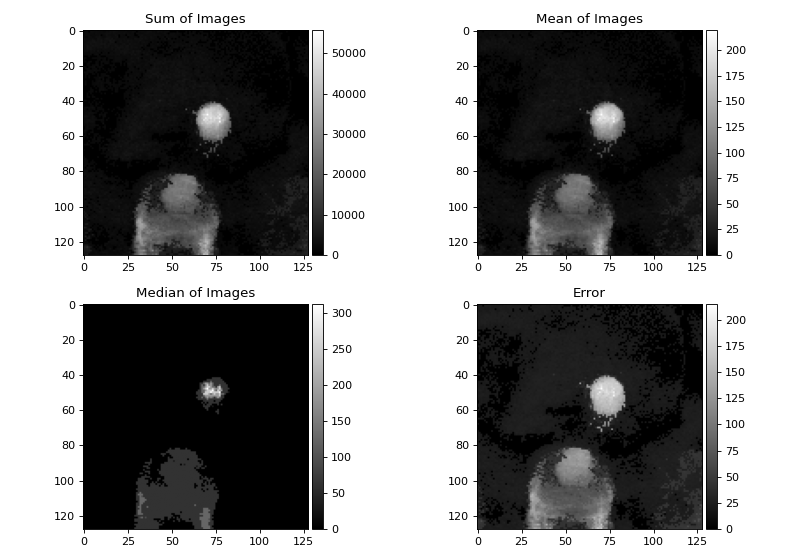 titles = ['Sum of Images', 'Mean of Images', 'Median of Images', 'Error']