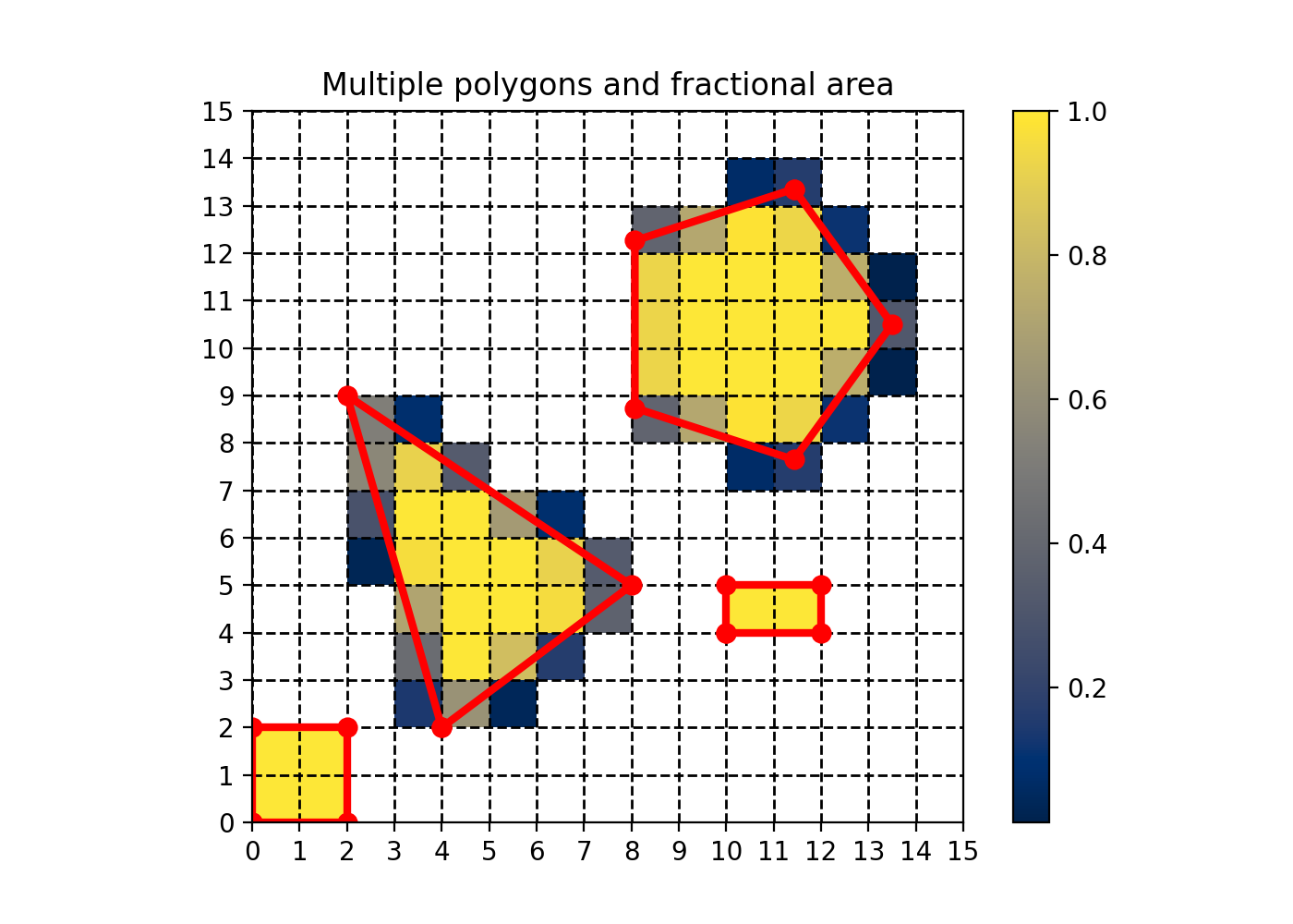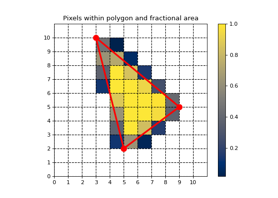 In the above plot, the fraction of pixel within the triangle is color coded.