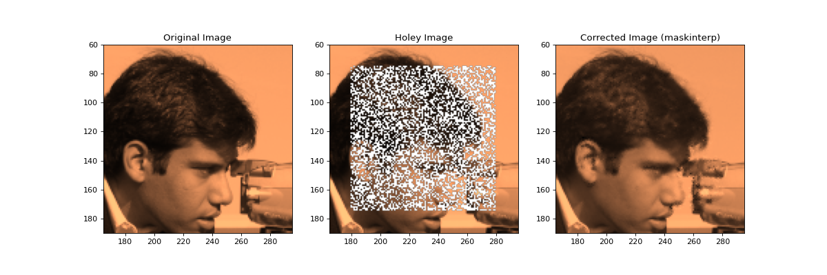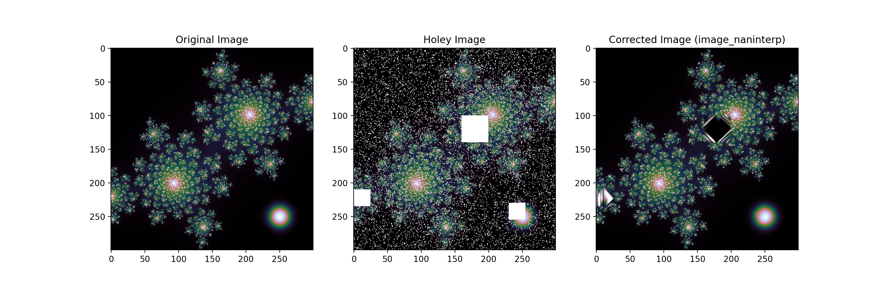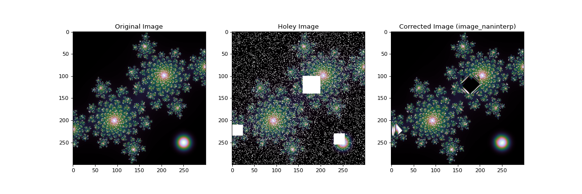 There are two different algorithms for filling holes in an image. Holes are defined by either a 2-D array mask of bool values, the same shape as the image, in which False indicates a hole or bad value, and True indicates a value that is valid. The alternative is to use NaN values in the image itself to identify holes in the image that should be filled in.
