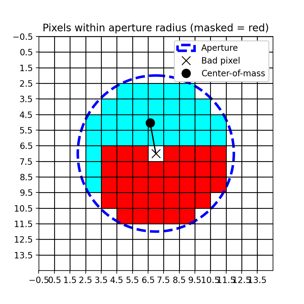 minpointsparameter.2. The bad pixel is within a certain distance from the center-of-mass of good pixels within the aperture. For example, this would stop extrapolation in the case where there were enough good pixels to theoretically perform a fit, but they were all to one side of the bad pixel. The default distance limit is 1 pixel and may be set with the