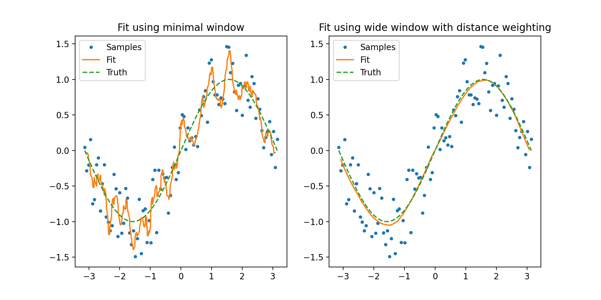 (\(\pi / 2 \approx 25 \text{ samples}\)) and a distance weighting