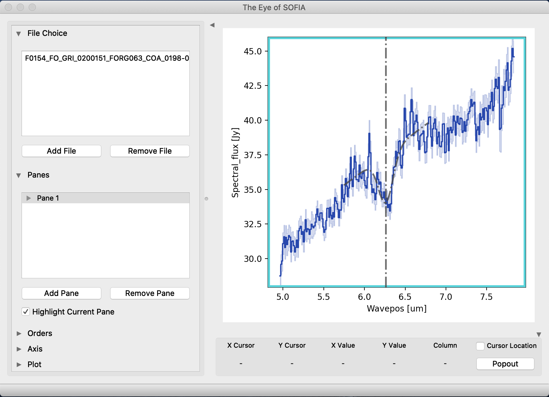 A common desire when exploring data is to fit some kind of line to the data, and the Eye of SOFIA obliges. Through keyboard shortcuts, the user can select a range of data and have a simple two component model fit to the selection. The fit is overplotted on the data for a quick check on if the fit worked, while the parameters of the fit are displayed in a separate window, where they can be saved to file.